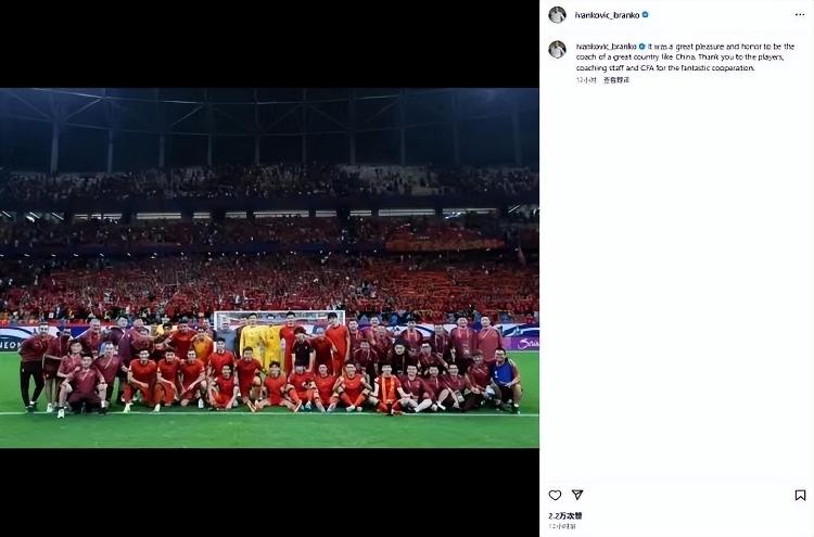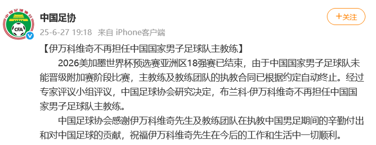 中国足球协会感谢伊万科维奇先生及教练团队在执教中国男足期间的辛勤付出和对中国足球的贡献,祝福伊万科维奇先生在今后的工作和生活中一切顺利。