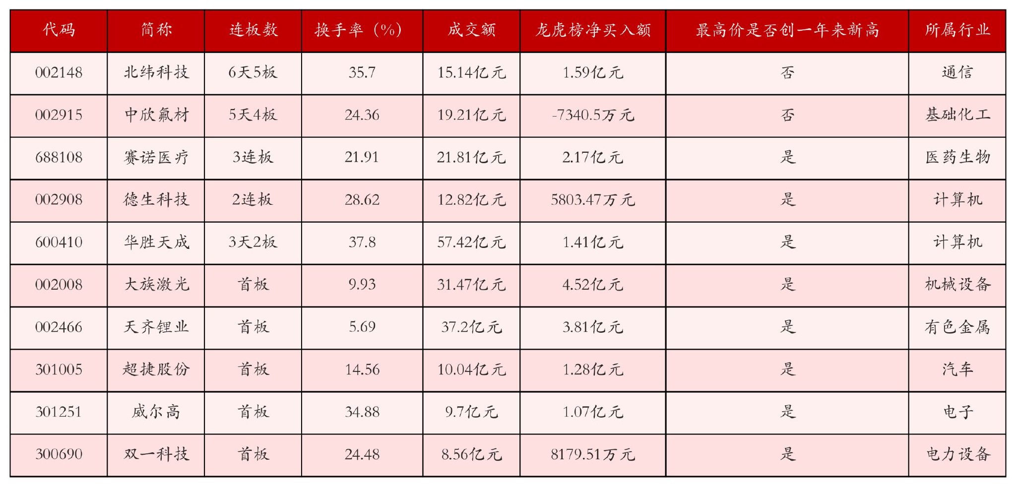 截至8月11日收盘,上证综指上涨0.34%,收于3647.55点,深证成指上涨1.46%,收于11291.43点,创业板指上涨1.96%,收于2379.82点。今日沪深两市A股共计85只涨停,综合当前连板数以及当日龙虎榜数据,其中较为强势的前三只个股分别为:北纬科技(002148)、中欣氟材(002915)与赛诺医疗(688108)。今日强势个股前10位具体数据见下表: