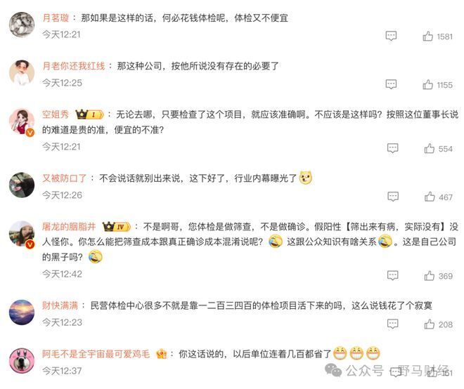 舆论一时哗然,有网友认为"那如果是这样的话,何必花钱体检呢,体检又不便宜。""那这种公司,按他所说没有存在的必要了"。还有网友表示"无论去哪,只要检查了这个项目,就应该准确啊。不应该是这样吗?""不会说话就别出来说,这下好了,行业内幕曝光了"" 民营体检中心很多不就是靠一二百三四百的体检项目活下来的吗,这么说钱花了个寂寞"。