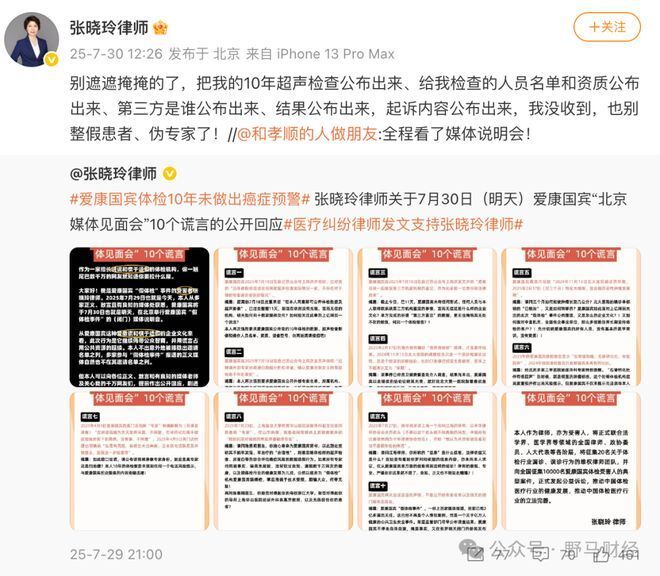 对于爱康的起诉,张晓玲律师展现出法律专业人士的强硬姿态。她通过微博公开喊话:关于媒体见面会的 10 个谎言的公开回应。称"别遮遮掩掩的了,把我的 10 年超声检查公布出来、给我检查的人员名单和资质公布出来、第三方是谁公布出来、结果公布出来,起诉内容公布出来,我没收到,也别整假患者、伪专家了!"