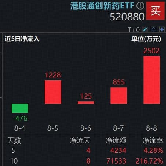3、国产创新药进入技术成果爆发期,国家药监局数据显示,上半年共批准创新药43款,同比增长59%,接近2024年全年48个的总量。医药魔方也显示,2025年上半年,我国药企对海外的授权总金额已超去年全年,达608亿美元,全年增速有望达到一个新的高度。上周港股通创新药短期回调,资金整体呈现逢跌加仓态势。港股通创新药ETF(520880)近4日连续吸金,合计获资金净流入4710万元。时间拉长至近10日,港股通创新药ETF(520880)累计获资金净流入7.15亿元。